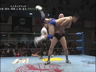 Soma is a DDT wrestler that I think spends as much time in All Japan as he does in DDT. Aoki tries shoulderblocking Soma but Soma kips up and knocks Aoki out of the ring before kipping up again. Baseball slide by Soma and he goes up top, hitting a doublestomp to Aoki’s back as he is getting up. That was a painful looking move for the second match on the card. Back in the ring and Soma stomps on Aoki before slamming him to the mat. Aoki regains the advantage, he beats on Soma and throws him out of the ring before slamming Soma into the guard rail multiple times. Aoki slides Soma back in and stomps on him before hitting a vertical suplex. Aoki slaps on the crab hold so they can take a breather, Soma gets to the ropes and Aoki stomps on Soma’s back. Soma goes for a dropkick by Aoki avoids it, but Aoki can’t avoid the second one. Soma charges in but Aoki moves out of the way and hits a doublestomp followed by a sliding kick. Soma goes up top and hits a missile dropkick, Soma bounces off the ropes but Aoki hits a dropkick. Aoki throws Soma in the corner and hits a jumping elbow. They trade elbows and headbutts, Soma goes up top after flooring Aoki and he hits a diving body press for a two count. Quick kick by Soma and he gets another two. Soma picks up Aoki but Aoki wiggles away and drop Soma. Aoki drops Soma onto his knee and they trade moves, with Aoki getting the best of it with a lariat. Aoki hits a backdrop suplex and he puts Soma in a Texas Cloverleaf, picking up the submission victory. Atsushi Aoki is your winner. A meh match for me, Soma doesn’t do much for me and Aoki needs the right opponent to really excel. The action was crisp, just not overly interesting. Score: 4.5