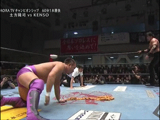 This is for the GAORA TV Championship. KENSO is just awful but he knows he is awful, so does that make him good because he understands his limitations? Just trying to use the logic people use to excuse the existence of Big Show. Hijikata takes it to KENSO to start things out and throws him out of the ring, but KENSO smartly runs away. Hijikata catches up with him and beats KENSO around the ring, but KENSO is in his element and turns the tables. KENSO throws Hijikata back in the ring after a bit and slaps him. They both trade slaps, KENSO goes for a boot but Hijikata slaps him. High kick by Hijikata in the corner and hits a vertical suplex before kicking Hijikata in the back. Hijikata dropkicks KENSO in the knee and hits a Shining Wizard modification for a two count. Hijikata charges KENSO but KENSO hits a lariat. KENSO goes up top but Hijikata kicks KENSO in the head and hits a superplex. Suplex, but KENSO kicks out of the pin attempt. KENSO throws the referee in front of him so that Hijikata hits him, kicks by Hijikata but KENSO chokes him with his feathery belt. Brainbuster by KENSO as the referee magically revives and counts the two count. Hagakure by KENSO and he finishes off Hijikata with a diving elbow drop for the three count. KENSO is still the champion. The issue I have with 'ol KENSO is half the match was wasted on outside the ring brawling that any child or rookie could do. It is just unimaginative. I liked the conclusive ending though, he killed Hijikata dead with that Hagakure. Score: 3.5