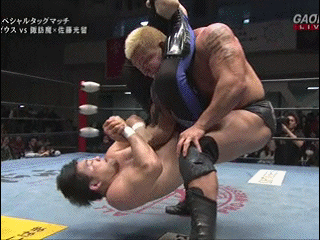 This match is for All Japan Triple Crown. After the standard opening match strike exchange, Doering wins with a hard shoulderblock. They lock knuckles and Doering knocks Shiozaki to the mat. Doering chops the hell out of Shiozaki but Shiozaki chops him back. Doering wins the battle and Shiozaki rolls out of the ring, but Doering goes out after him and slides Shiozaki back into the ring. Elbow drop by Doering and he headbutts Shiozaki into the corner. Shiozaki kicks back Doering but Doering chops him again. Doering goes for a suplex but Shiozaki blocks it. Shiozaki hits his own vertical suplex but Doering kicks back Shiozaki. Chop by Shiozaki but Doering chops him back and they get into it again. Backdrop suplex by Shiozaki and he kicks Doering for a two count. Fisherman buster by Shiozaki but Doering gets a shoulder up in a surprisingly close near fall this early in a title match. Chops by Shiozaki but Doering hits a pair of lariats followed by an elbow drop for a two count. Delayed vertical suplex by Doering, but he gets another two. DDT by Shiozaki but Doering gets back up, so Shiozaki hits another one. Hard lariat by Shiozaki and that finally gets Doering on the mat. Doering doesn’t look too good. He slowly gets up but Shiozaki rocks him with another lariat. I am loving Doering’s selling, that or he is genuinely knocked loopy. Doering rolls out to re-group but Shiozaki sails out onto him with a plancha suicida as both wrestlers land back into the guard rail. Shiozaki pushes the dead weight back in the ring and chops Doering in the corner. Shiozaki puts Doering up on the top turnbuckle and he hits a Frankensteiner for a two count. Vertical suplex into a sitout slam by Shiozaki but it gets two, he goes for a Limit Break but Doering pushes him away.
