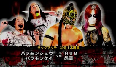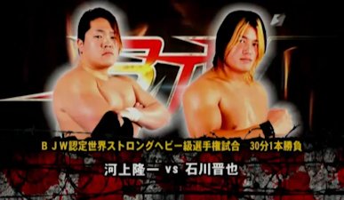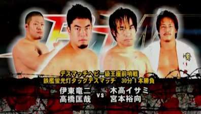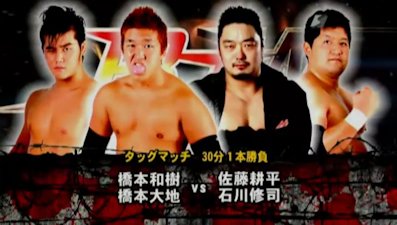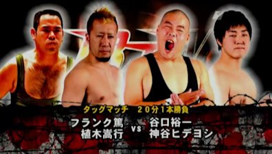 Date: February 7th, 2014 Back to Big Japan! This event has a decision match for the Big Japan Strong World Heavyweight Championship which had been vacated the previous month when Daisuke Sekimoto was injured. We also have an Iron Cage match (something a little different) and a one match W-1 invasion just to spice things up. Here is the full card: - Frank Atsushi and Takayuki Ueki vs. Yuichi Taniguchi and Hideyoshi Kamitani Since this aired on Samurai! TV some matches will be clipped, just a heads up. Let's get started. Frank Atsushi and Takayuki Ueki vs. Yuichi Taniguchi and Hideyoshi Kamitani Cover by Kamitani but it gets a two count. Kamitani goes up to the top turnbuckle but Ueki avoids the missile dropkick. Ueki tags in Atsushi but Kamitani hits a lariat. Kamitani picks up Atsushi and clubs him into the corner, Irish whip by Kamitani but Atsushi moves when he charges in and hits a missile dropkick. Headbutt by Atsushi, cover, but Kamitani kicks out. Atsushi goes up to the top turnbuckle and hits a falling headbutt. Cover, but it only gets a two count when Taniguchi breaks it up. Atsushi knocks Taniguchi off the apron and tags in Ueki. They pick up Kamitani, double Irish whip by Kamitani to the corner and Ueki hits a body avalanche. Atsushi hits a tornado DDT on Kamitani then Ueki hits a diving crossbody for a two count. Ueki picks up Kamitani and clubs him in the chest. Ueki goes off the ropes and hits a dropkick, but Kamitani doesn't go down. Ueki goes for a slam but Kamitani blocks it and hits a slam of his own. Cover, but it gets a two count. Kamitani picks up Ueki and goes for a backdrop suplex but Ueki lands on top of him. Ueki goes off the ropes but Kamitani elbows Ueki in the chest. Backdrop suplex by Kamitani, cover, and it gets a three count. Your winners: Yuichi Taniguchi and Hideyoshi Kamitani Match Thoughts: Just a basic young lion style match. Not a lot of substance or anything like that and it was pretty by-the-numbers. The tag outs didn't really have transitions, it was more of a "your turn!" type situation. I don't mind matches like this as wrestlers have to get practice in front of the crowd, but still it was a pretty mundane match. Score: 3.5 Brahman Shu and Brahman Kei vs. HUB and Onryo Shu and Kei pick up HUB, double Irish whip but HUB hits a lariat onto both of them. HUB tags in Onryo, but Shu hits him with a kendo stick. Shu tries to hit him again but Onryo blocks it, then Shu hits Kei by accident. Shu hits himself by bouncing it off the ropes, and Onryo drops him with a tornado DDT. Cover, but it gets a two count. Onryo tags in HUB, HUB and Onryo throw Shu into the corner and HUB hits a superkick. Reverse hurricanrana by Onryo, then HUB hits a sliding kick. Cover, but Kei breaks it up. HUB picks up Shu and puts him onto his shoulders, but Shu slides off and Kei hits HUB with a metal plate. Kei grabs a blue bucket with water but HUB pushes him back and throws the water onto Kei. Shu gets into the ring and tries to spit the black stuff at HUB, but HUB blocks it with the bucket. Kei gets up but HUB gets Kei onto his shoulders and hits the Viper Strike. Cover, and HUB picks up a three count. Your winners: HUB and Onryo Match Thoughts: The Brahman's certainly don't have boring match, even if they are a bit silly. There wasn't any downtime here as what began as normal tag rules quickly changed to more of a tornado tag since the Brahmans basically do whatever they want. I love HUB and wish I could have seen him in a more 'normal' match but it was still good to see him anyway. It was short and random, but I can't really say it was bad. Just different. Score: 5.5 Jaki Numazawa, Masashi Takeda, and Tsukamoto vs. Kankuro Hoshino, Inematsu, and Masato Inaba Hoshino punches Numazawa against the ropes, he goes off the far ropes but Numazawa hits a lariat. Numazawa gets the barbed wire bat, puts Hoshino on his shoulders and hits a fireman's carry roll while holding the bat against Hoshino's back. Cover, but it gets a two count. Numazawa grabs Hoshino and holds him so that Tsukamoto can superkick him. Leg drop by Takeda, cover by Numazawa but it gets broken up. Numazawa sets up a chair pyramid in the corner, he grabs Hoshino and tries to throw Hoshino into it, but Hoshino gets out of it and kicks Numazawa into the chairs. Inaba gets into the ring, they pick up Numazawa and Inematsu hits Numazawa. Senton by Hoshino, cover by Inaba but it gets a two count. Inaba picks up Numazawa, Inaba slams Numazawa in front of the corner and he goes up to the top turnbuckle. Inaba jumps off the top but Numazawa moves out of the way and Tsukamoto superkicks him from behind. Inematsu and Inaba get into the ring but Takeda hit a suplex onto both of them. Numazawa gets a barbed wire bat as they pick up Inaba, Numazawa hits Inaba with the bat in the corner and then Takeda hits a running strike. Triple Powerbomb to Inaba, cover, but it is broken up. Numazawa chokes Inematsu with a chair while Tsukamoto ties up Hoshino with another chair. Takeda knees Inaba in the chest, cover, but it gets a two count. Takeda picks up Inaba and hits the U Crash onto the barbed wire bat. Cover, and Takeda picks up the three count. Your winners: Jaki Numazawa, Masashi Takeda, and Tsukamoto Match Thoughts: The good thing about this style of match is that there really isn't any down time. I liked the definiteness of the ending, Inaba was destroyed and his partners were equally tied up so everyone in the building knew who the better tag team was. Sometimes it is ok to have a dominating victory, not all matches need ten 2.9 counts. Besides the chair pyramid, the weapon usage was integrated well into the match and the barbed wire bat was used quite a bit throughout the entire thing. A fun hardcore brawl. Score: 6.5 Kaz Hayashi and Shuji Kondo vs. MEN's Teioh and Shinobu Kondo comes in the ring but Teioh catches him with a side slam onto his knee before slamming Hayashi to the mat as well. Teioh picks up Hayashi, Irish whip