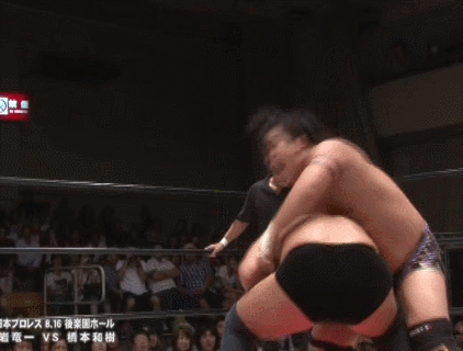 Takaiwa finally gets the advantage with a lariat, scoop slam by Takaiwa and he goes up top, hitting a diving elbow drop for a two count. Hashimoto hits a dragon screw to get back in control and applies an ankle hold, but Takaiwa gets to the ropes. Big kick by Hashimoto and he boots Takaiwa again, Hashimoto picks up Takaiwa and goes for the fisherman suplex but Takaiwa reverses it with a vertical suplex of his own.