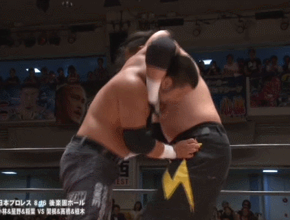 They trade elbows to start until Hashimoto hits Takaiwa with a big lariat. Takaiwa rolls out of the ring but Hashimoto goes out after him and kicks Takaiwa from the apron. Hashimoto throws Takaiwa into the crowd and kicks him in the chest, but Takaiwa chops Hashimoto back and they trade shots on the floor. Hashimoto kicks Takaiwa in the leg until he collapses and returns to the ring, with Takaiwa slowly following. Hashimoto keeps kicking at Takaiwa in the leg and ten hits a few elbows before going back to the leg again. I have a feeling Hashimoto may regret this shortly. Hashimoto elbows Takaiwa into the corner and twists his injured leg in the second rope.