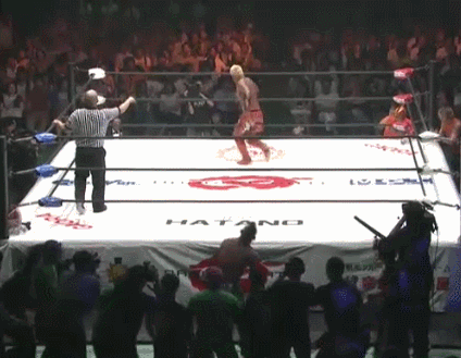 This match is for the Open The Triangle Gate Championship and is an Elimination Match. Nine wrestlers? Yea I am not killing myself on this one. One wrestler from each team is legal at a time, just to add to the chaos. Horiguchi, Kzy, and Gamma begin the match but it is a slow start as they throw in some comedy spots. The next three come in and take things more seriously but still nothing is accomplished and the next three enter the match. Having this as a constant three way seems restrictive as the first few minutes had really no flow to it. It is like two wrestlers take turns wrestling while the other watches, then they take turns in that manner. But no real damage is being done. The action spills out to the floor as they battle all the way up into the bleachers, getting really far away from the ring. They return after a bit with Fujii and Saito being the legal men and they trade chops back and forth. Gamma and Susumu come in as they all chop Fujii, then Mochizuki and company all come in to chop Fujii too. Fujii chops everyone as this goes on for a bit, then Susumu is triple teamed. Fujii punches Kzy and hits a big lariat, he puts Kzy on the top turnbuckle and tosses him back down to the mat before CIMA comes in. Gamma spits water on Kzy’s face (which is gross) as the assault on Kzy continues until he fights back against CIMA, Susumu wonders in so I guess he is the other legal man but Kzy kicks back everyone before his teammates finally start helping. CIMA and Gamma hit tope suicidas out of the ring, then Horiguchi and Kzy hit stereo tope con hilos. Mochizuki goes next with an ugly pescado, then Susumu flies out also. Fujii goes out to the apron and jumps onto the pack, and all nine wrestlers are down outside the ring.