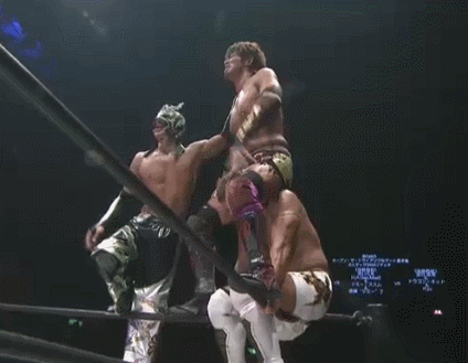 Double Irish whip to Sydal, drop toehold by Doi and YAMATO delivers a brainbuster for another two. Sydal is thrown into the corner but he kicks Doi back, YAMATO grabs Sydal but he knees out of the suplex attempt. Sydal hits a hurricanrana on Doi and he makes the hot tag to Ricochet. Ricochet hits jumping elbows to both his opponents and then makes YAMATO do a DDT to Doi. They fall out of the ring, Sydal comes back in and hits a flipping tope con hilo. Ricochet then goes off the ropes and sails out onto Doi and YAMATO as well, Ricochet slides YAMATO back into the ring and they trade elbows. YAMATO kicks Ricochet in the face near the corner, he goes off the ropes but Ricochet hits a jumping kick of his own followed by a suplex. Ricochet gets YAMATO on his shoulders but YAMATO wiggles away, YAMATO goes off the ropes but Ricochet hits a cutter. Sydal comes in the ring and they both kick YAMATO before hitting a standing moonsault/shooting star press combination. Doi comes in but Sydal drops him to the mat. Sydal goes off the ropes but Doi catches him with a sitdown slam for a two count cover. Doi picks up Sydal, Sydal elbows away and hits a quick Yoshitonic for a two count. Sydal kicks Doi in the leg, YAMATO comes in and holds Sydal so that Doi can dive off the top turnbuckle with a front flip senton. Sydal goes for a standing moonsault but Doi gets his feet up. Sliding kick by Doi, cover, but Ricochet breaks it up. YAMATO grabs Sydal and hits a pump-handle slam, Doi gets on the second turnbuckle but Ricochet jumps up with him. Doi pushes Ricochet off but then Sydal goes up with Doi and hits a back flip suplex for a two count. Ricochet and Sydal both kick YAMATO, leaving both of their opponents on the mat.