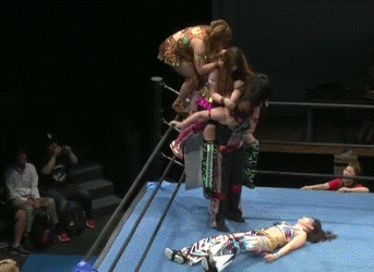 Kurumi grabs Tsukushi but Tsukushi rolls her up and hits a footstomp. Dropkick by Tsukushi while Kurumi is against the ropes and she hits a tilt-a-whirl press for a two count. Tsukushi chokes Kurumi with her boots but it is broken up. Somersault senton by Kurumi to Tsukushi, but she kicks out at two. Irish whip by Kurumi but Tsukushi hits a tilt-a-whirl headscissors. Tilt-a-whirl sunset flip by Tsukushi and she tags in Kizuki, but Kurumi hits a footstomp to Kizuki's back. Kizuki avoids the dropkick and hits a senton on Kurumi, Kizuki drop toeholds Kurumi into the corner and she hits a running crossbody. Diving senton by Kizuki off the second turnbuckle but it gets a two count. STF by Kizuki but Kurumi gets to the ropes, knees by Kizuki but Kurumi hits a swinging slam for a two count. Kurumi goes for a cross armbreaker and eventually gets it locked in, but Kizuki gets to the ropes. Kurumi picks up Kizuki and elbows her, but Shirai kicks Kurumi from the apron and Tsukushi dropkicks her. Double Wrist Armsault by Kizuki, she goes up to the top turnbuckle but Kurumi avoids the swivel body press. Hoshi runs in and hits a shoulderblock, Kurumi picks up Kizuki and slams her to the mat, she goes for a German suplex but Kizuki blocks it. Kizuki and Kurumi trade elbows until Kizuki hits a jumping lariat, but Kurumi comes back with a shoulderblock. Shirai and Hoshi are tagged in and they trade elbows, knee by Shirai and they trade strikes until Shirai hits a lariat. Shirai applies a Jorōgumo and rolls up Hoshi, but it gets a two count. Tiger Feint Kick by Shirai and she kicks Shirai in the chest before covering her for another two. Tsukushi stands on Shirai's shoulders and hits a footstomp, running boot by Shirai but it gets a two count. Shirai applies a sleeper and she applies the figure four necklock but Miyagi breaks it up with a body press. Shirai and Miyagi hit a double backdrop suplex on Shirai, cover by Hoshi but it gets two.