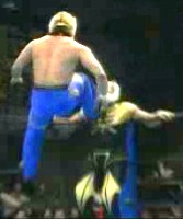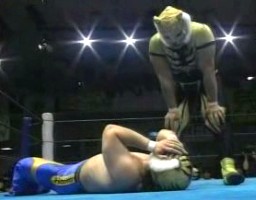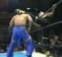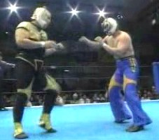 Tiger Mask eventually recovers and he goes for a punch of his own, but Sayama avoids it and knocks him down with a back kick. High kick to the head by Sayama, Tiger Mask gets up but Sayama avoids his charge and kicks him again. Tombstone piledriver by Sayama, he goes up to the top turnbuckle and nails a diving headbutt. Cover, but it gets a two count. Sayama picks up Tiger Mask and delivers a snap DDT, cover, but again Tiger Mask kicks out. Sayama picks up Tiger Mask and hits the spinning back kick, slaps by Sayama while Tiger Mask is against the ropes and he goes off the far ropes, but Tiger Mask pulls the top rope down and Sayama falls out of the ring. Tiger Mask then goes off the far ropes and sails out onto Sayama with a tope suicida. Tiger Mask gets back in the ring first, and when Sayama prepares to re-enter the ring Tiger Mask goes for a high kick as Sayama is on the apron. Sayama blocks the kick however and delivers a high kick of his own, which stuns Tiger Mask. Sayama quickly comes over the top rope with a sunset flip, and he picks up the three count! Your winner: Original Tiger Mask And in the end, the protégé was unable to beat the master as Sayama was never in any real trouble during the match. Tiger Mask tried to copy his teacher's moves, duplicating the Tiger Wall Flip and cross armbreaker, but when he went for the high kick Sayama was too fast and made him pay. The sunset flip was more a move of quickness then necessity or desperation, as Tiger Mask was out on his feet and stayed on the mat for some time after the bell. As of this day, Tiger Mask IV has never beaten Sayama, as Sayama has always been one step ahead of his student. But Tiger Mask IV has done his teacher proud, as he has had 9 titles around his waist and will no doubt have more before all is said and done in his career. In 1997 he still had a lot to learn however, and Sayama didn't hesitate to show Tiger Mask IV that he still had a ways to go to be the best man to ever wear the Tiger Mask. review completed on 12/11/08