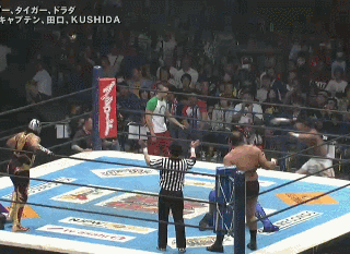 Back up, Taguchi hits a hip attack but Liger blocks the next one with an atomic drop. Taguchi hip attacks Liger out of the ring but he fakes a dive before dancing in the ring. Liger tags in Dorada while Taguchi tags in KUSHIDA and this may be the only entertaining pairing of the entire match. They flip around, KUSHIDA blocks the armdrag attempt with a cross armbreaker attempt, but Dorada gets to the ropes. Missile dropkick by Dorada and he makes the tag to Tiger Mask. Tiger Mask and KUSHIDA trade strikes, enzigieri by KUSHIDA but Tiger Mask hits a backbreaker. Tiger Driver by Tiger Mask, but it gets a two count. Tiger Mask tags in Liger. Liger stretches KUSHIDA and tags in Nagata. Nagata kicks KUSHIDA in the chest but KUSHIDA flips out to the apron. Nagata punches KUSHIDA as he springboards into the ring but KUSHIDA hits the handspring back elbow. KUSHIDA tags in Nakanishi and Nakanishi mauls everyone, Nakanishi chops Nagata back into the corner and he hits a lariat. Nagata kicks him back and they trade elbows before trading slaps.