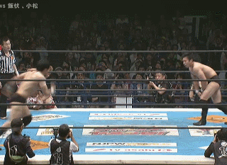 Seems like an odd match for Ibushi and Naito but it should be a fun one. Ibushi and Tanaka start off and trade waistlocks then wristlocks. Ibushi knocks Tanaka to the mat and follows with a shoulderblock. Ibushi goes off the ropes but Tanaka hits an armdrag followed by a dropkick. Tanaka tags in Naito so Ibushi tags in Komatsu. Naito gets Komatsu into the ropes but switches with him and chops Naito in the chest. They trade chops and Naito elbows Komatsu in the back of the head. Komatsu goes off the ropes and he hits a hurricanrana, he tries to pick up Naito but Naito blocks it. Big back bodydrop by Naito and he starts working over Komatsu's back. Naito tags in Tanaka, Tanaka kicks down Komatsu in the corner and he hits a scoop slam for two. Tanaka tags in Naito, scoop slam by Naito and he knocks Ibushi off the apron. Sidewalk slam by Naito but Komatsu kicks him away. They trade elbows, Komatsu knocks Naito off his feet and tags in Ibushi. Ibushi hits a swandive missile dropkick on Naito followed by a kick combination. Standing shooting star press by Ibushi but the cover gets two. Powerslam by Ibushi and he goes for a moonsault off the second turnbuckle, but Naito gets his knees up.