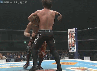 with Styles and Okada trading shots in the ring. Okada hits a big back bodydrop, YOSHI-HASHI and Takahashi come in the ring and YOSHI-HASHI knocks Takahashi to the mat. Okada and Styles come back in, elbows by both but Okada hits a sliding kick. Okada tags in YOSHI-HASHI but Styles elbows him and tags in Takahashi. Takahashi slaps at YOSHI-HASHI but YOSHI-HASHI hits a hurricanrana. Takahashi powerbombs YOSHI-HASHI into the corner, Styles comes in and he takes YOSHI-HASHI outside the ring and throws him over the table at ringside. YOSHI-HASHI slowly makes it back and Takahashi works him over with punches. Takahashi drops YOSHI-HASHI's neck on the top rope and he covers him for two. Styles is tagged in as the assault on YOSHI-HASHI continues, but after a few minutes YOSHI-HASHI reverses Takahashi's Fisherman Buster into a neckbreaker. YOSHI-HASHI tags in Okada and Okada elbows Takahashi and Styles. Okada puts Styles on the top turnbuckle and knocks him to the floor before hitting a DDT on Takahashi. Okada hits a flap jack on Takahashi, cover, but it gets two. Styles elbows Takahashi in the corner before hitting a scoop slam, Okada goes for a boot but Takahashi catches his foot and hits a Fisherman Buster. Takahashi tags in Styles and Styles suplexes Okada into the turnbuckles. Styles calls for the Styles Clash but Okada hits a reverse neckbreaker.