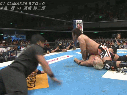 Backdrop suplex by Goto but Okada comes back with the flapjack.