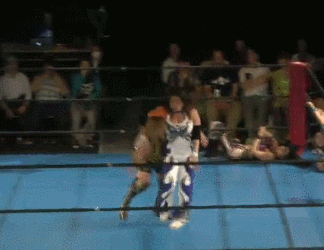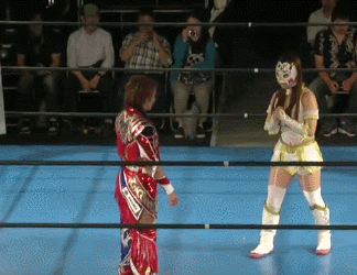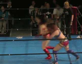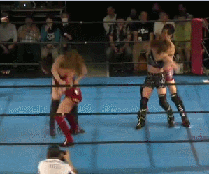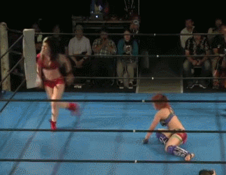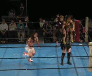 Wait no they are re-starting it. Damn. Kato and Hirota are the first two legal wrestlers, wristlock by Kato and she kicks Hirota in the arm. Mizunami comes in to help, as if Kato needed it, and they take turns hitting leg drops on Hirota. Kato tags in Mizunami and Mizunami hits a shoulderblock. Another shoulderblock by Mizunami, Irish whip by Mizunami but Hirota avoids her charge. Scoop slam by Hirota and she tags in Nipponbashi. Kato tags in too and Nipponbashi dances around. She seems more confused than usual. Kato uppercuts Nipponbashi but Hirota breaks up the pin. Kato Irish whips Nipponbashi but Nipponbashi gets her wand. Nothing happens for a bit until Nipponbashi uses the wand on Mizunami and Hirota. Kato just stands there, they try again with the same result. Nipponbashi yells at Kato, she gets the wand again and tells everyone to try again. Finally Kato is impacted by the wand and everyone celebrates, cover by Nipponbashi but Mizunami breaks it up. Hirota grabs Kato’s arm, she goes up to the ropes and walks them, but she trips and falls. Drop toehold by Hirota, she wraps up Kato in the ropes and she puts Mizunami in the ropes on the other side. Oil Check by Hirota to both, Kato and Mizunami get on the mat but they avoid Nipponbashi and Hirota’s body press. Mizunami spears both of them, Kato goes up top and she hits a cannonball. Kato picks up Hirota, but they do a kiss/wand combination as Hirota rolls up Kato for a two count. Mizunami spears Hirota and Kato knocks her loopy with a heel kick, but Hirota lands on top of Kato for the three count! What hurt this one to a degree is I just watched a match with the same formula on the previous show, but done better. Nipponbashi’s act is best for me in small doses and a match this long doesn’t qualify as ‘small’. Kato was great but nothing else was entertaining.