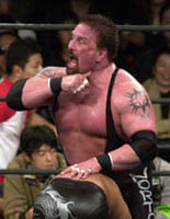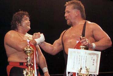 Pictures: Featured Signature Moves: Other Signature Moves: Career History: For a person that at first wasn't even interested in professional wrestling, Scott Norton ended up having one of the greatest careers of any gaijin in the history of New Japan Pro Wrestling. A world-class arm wrestler, Norton won multiple arm wrestling championships in the United States and was respected as one of the top arm wrestlers in the world. Arm wrestling is where he got the nickname "Flash," as he was able to defeat his opponents very quickly. After deciding to get into pro wrestling, Norton was trained by Brad Rheingans, who also trained Vader, John Bradshaw Layfield, Jerry Lynn, and many others. After wrestling in the AWA and the Pacific Northwest, Scott Norton joined New Japan Pro Wrestling in the winter of 1990. Norton almost immediately got a monster push. The fans of New Japan knew power when they saw it, and even though Norton was still a little rough around the edges he reminded fans of Vader and Bigelow..... big wrestlers with power but also agility and speed. In the spring of 1991 he scored his first big pinfall victory, over the young and popular Keiji Mutoh. Not only did he beat him, but he defeated Mutoh in under 10 minutes. Norton participated in the first G1 Climax in 1991, but even though he beat Mutoh again he wasn't able to reach the finals. In December, Norton got his first shot at the IWGP Heavyweight Tag Team Championship but came up short. Still, it is very rare in New Japan for a wrestler within two years of debuting to get a title shot, which shows just how impressed New Japan was with Norton's ability in the ring. Over the next few years Norton wrestled almost exclusively in New Japan and became the top gaijin when Vader left the promotion. He won his first IWGP Heavyweight Tag Team Championship with Tony Halme on November 22nd, 1992 when they defeated The Steiner Brothers. After losing the belts to The Hellraisers, Norton found a new partner in Hercules Hernandez and together they formed the Jurassic Powers. The Jurassic Powers would challenge The Hellraisers and win the IWGP Heavyweight Tag Team Championship on August 5th, 1993. This would be a longer reign for Norton as they would have three successful defenses before dropping the titles back to The Hellraisers on January 4th, 1994. Soon after this Hernandez would leave New Japan and Norton would go back to focusing on the singles division. From 1992 to 1995 Scott Norton had four shots at the IWGP Heavyweight Championship but each time came up short even as he seemed to be getting closer and closer. His last two defeats would be to Shinya Hashimoto, who proved to be Norton's ultimate road block to gaining the top title in the promotion (ironically, Norton and Hashimoto reluctantly teamed for the Super Grade Tag League in 1996.... and ended up winning). In fact, Norton never pinned Hashimoto in a singles match in his career, as the New Japan trueborn was too much for Norton to overcome. Norton also had title loses to Great Muta and Riki Choshu. Starting in the mid-90s, Norton began wrestling in WCW more as well, as he split time between the two promotions. One of the biggest outcomes of this was that Norton joined the nWo in WCW and also was a part of the faction in New Japan as well. The New Japan version of nWo was lead by Masahiro Chono but also included (at various times) Hiroyoshi Tenzan, Keiji Mutoh, Great Muta, Satoshi Kojima, Hiro Saito, and also some of the American nWo members that would come to Japan with Norton. As he was in WCW, Norton was the muscle of the group in New Japan as well but he was more successful in the ring. With his nWo friends having his back and reaching the peak of his in-ring ability, Norton again challenged for the IWGP Heavyweight Championship in 1998. On August 8th, 1998 Masahiro Chono won the IWGP Heavyweight Championship for the first time in his career. What was a happy moment quickly turned disappointing as he was injured and forced to vacate the title. On September 23rd, 1998 a decision match to crown a new IWGP Heavyweight Champion was held between Scott Norton and Yuji Nagata. Nagata fought valiantly but he could not match Norton's power and Norton finally won the IWGP Heavyweight Championship on his fifth try. In his first defense he finally defeated Hashimoto (although it was by Count Out) and he also beat Manabu Nakanishi. His reign however would end on January 4th, 1999 when he fought Keiji Mutoh in the main event of the Tokyo Dome in front of over 60,000 fans. Keiji Mutoh would win with his figure four leg lock, and Mutoh would go on to hold the title for a full year. Norton was not done in New Japan however. In fact, the same year that Keiji Mutoh defeated Scott Norton for the title the two would team up to win the G1 Tag League, the second time that Norton won the annual tag team tournament. By this time the nWo had split but Norton stayed in the nWo as they feuded with Team 2000 (Masahiro Chono's group). The feud would last for all of 1999, but it ended on January 4th, 2000 when Chono defeated Mutoh and forced him to break up the nWo. Always the opportunist, Norton joined Team 2000 after the nWo went under and stayed with them until the group disbanded. As 2001 started, Norton had been in New Japan for a decade and the constant grind was beginning to show. Even though he was no longer as agile as he once was and didn't have the stamina he had possessed in the mid-90s, he was still a powerhouse that was a threat to everyone in the promotion. On March 17th, in the middle of the Hyper Battle Tour, Norton got another chance at the IWGP Heavyweight Championship against Kensuke Sasaki. Sasaki was on a great run as he had just defeated Satoshi Kojima, Masahiro Chono, and Toshiaki Kawada all in one night just two months earlier to win the title. Everyone thought this would just be a standard defense, but Norton shocked the world when he pinned Sasaki after a jumping lariat to win the IW